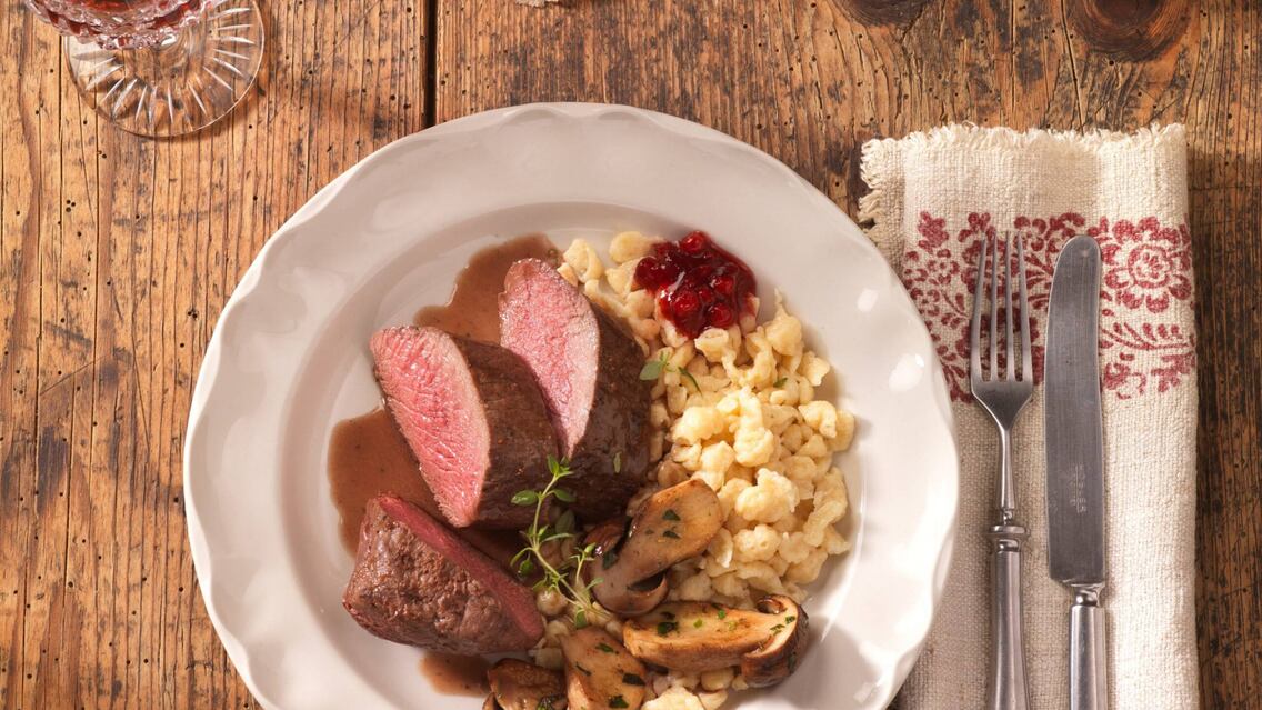 - Den Hirschrücken aus der Pfanne nehmen, 10 Minuten ruhen lassen und dann in Scheiben schneiden.